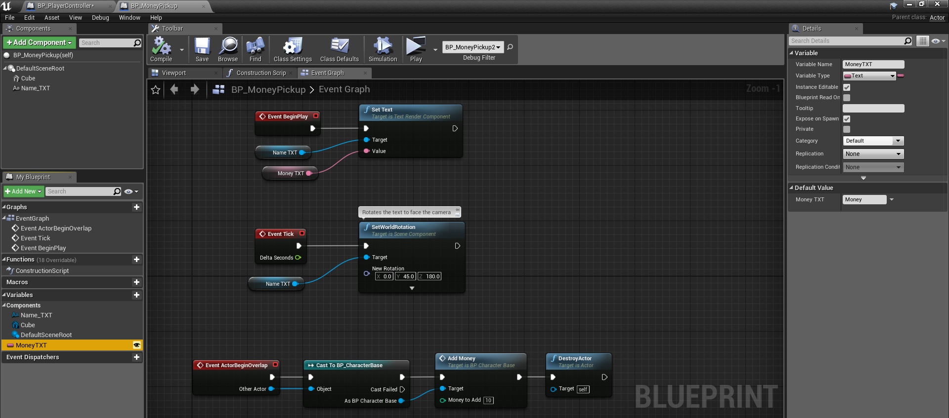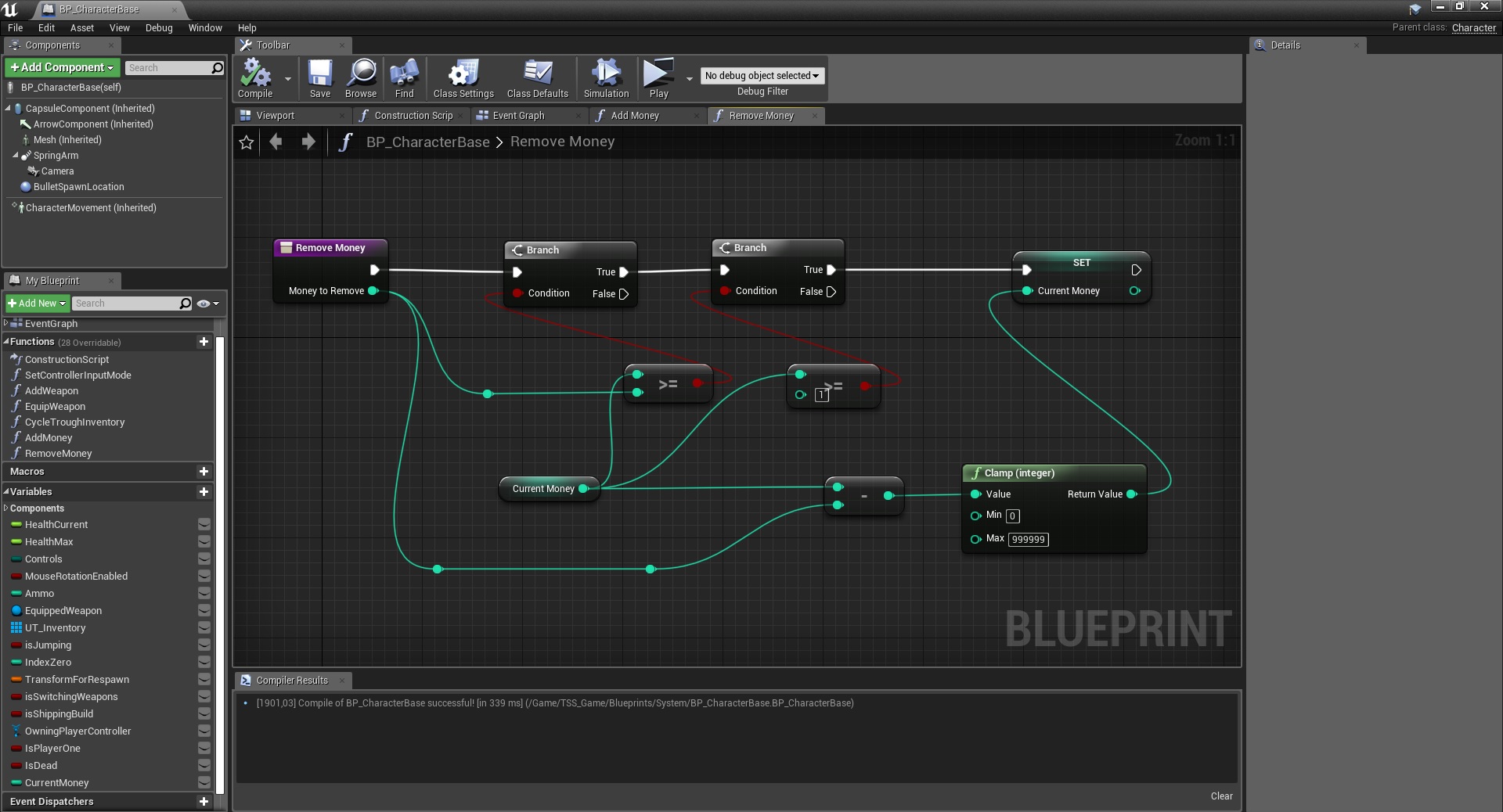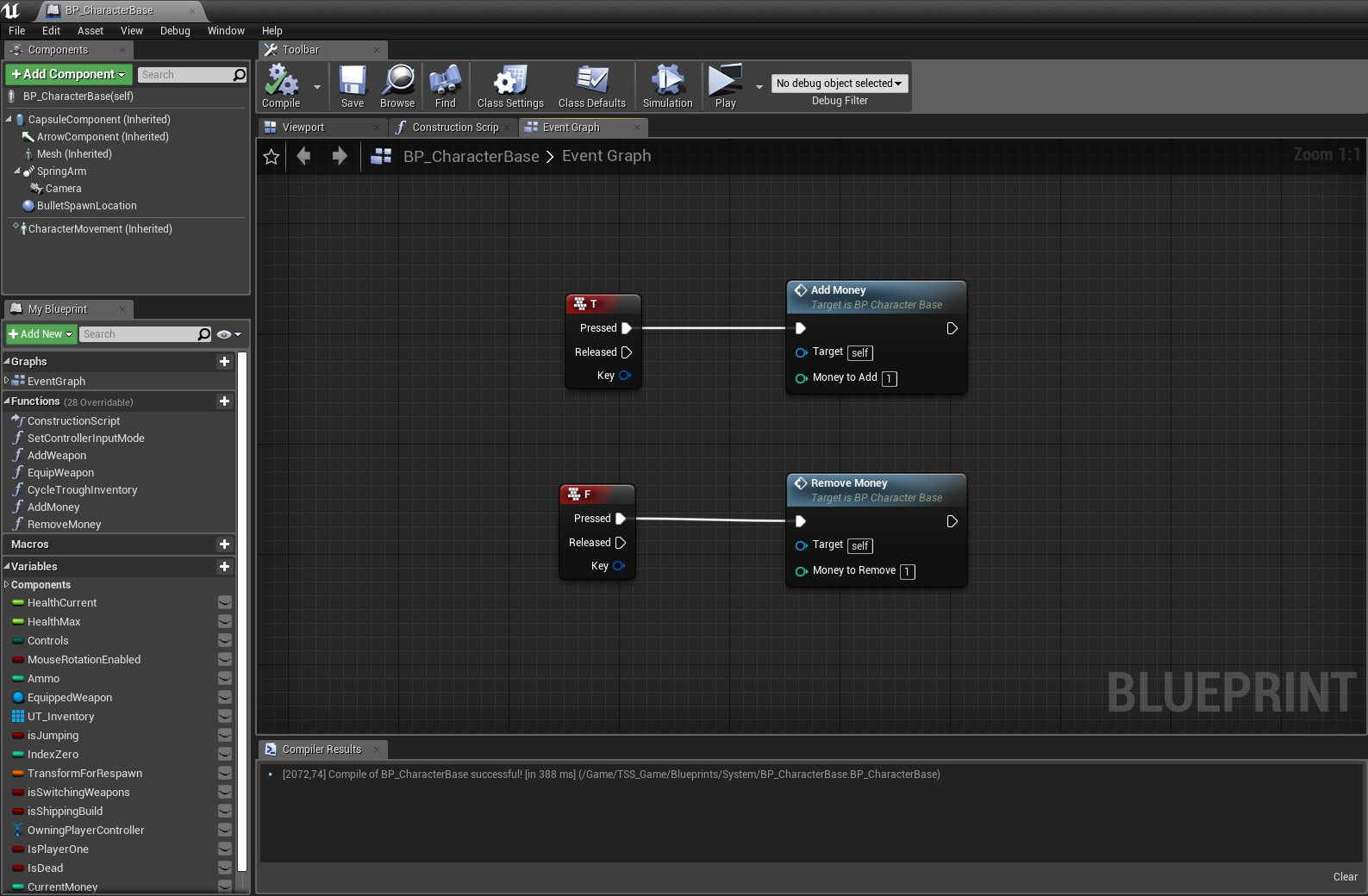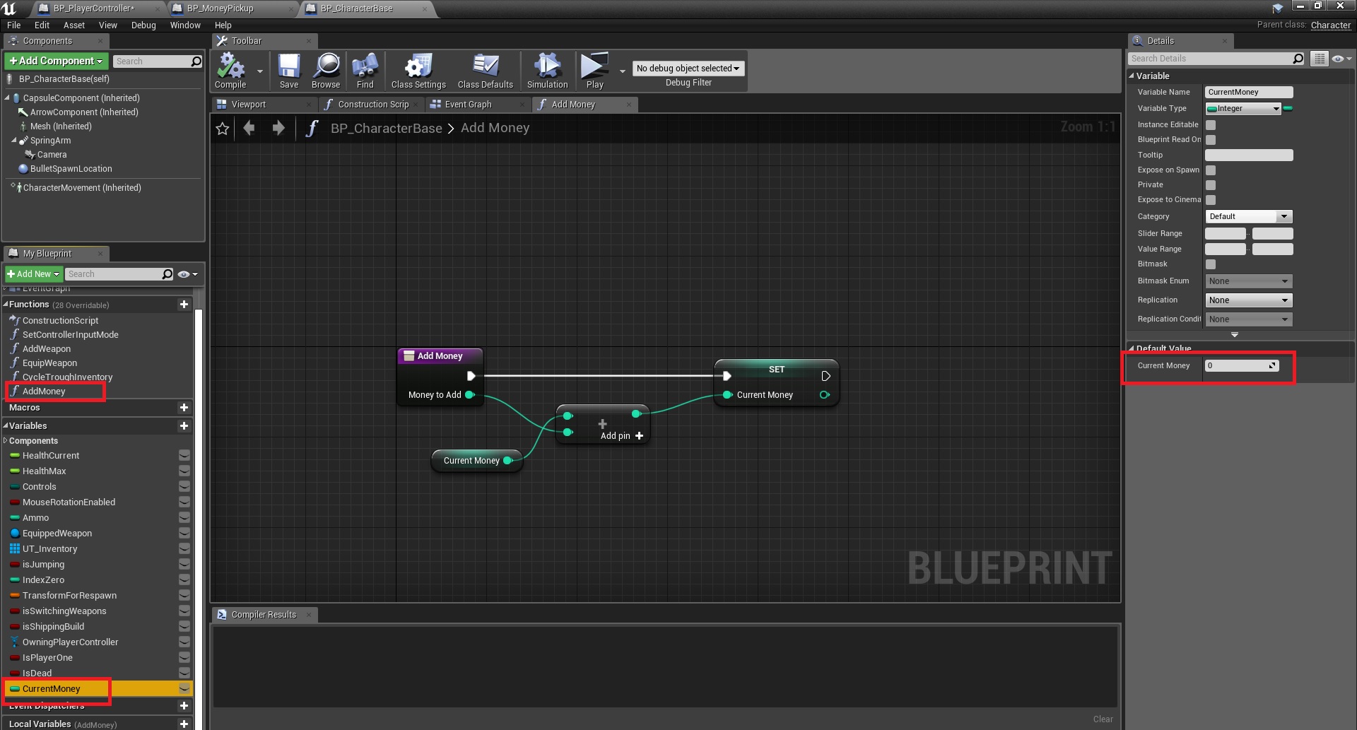 1. Add a new int variable to BP_CharacterBase and two new functions AddMoney and RemoveMoney. Both functions have one input variable (int).