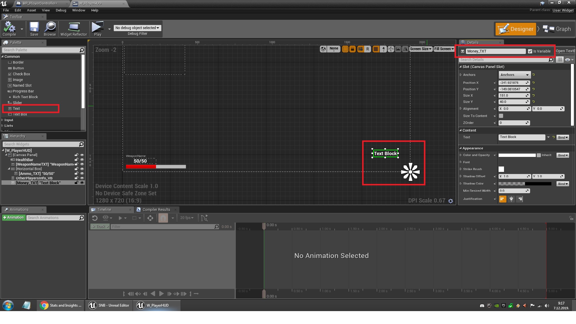3. Open the W_PlayerHUD widget and add a text to it, make sure to set it as a variable in the upper right corner.