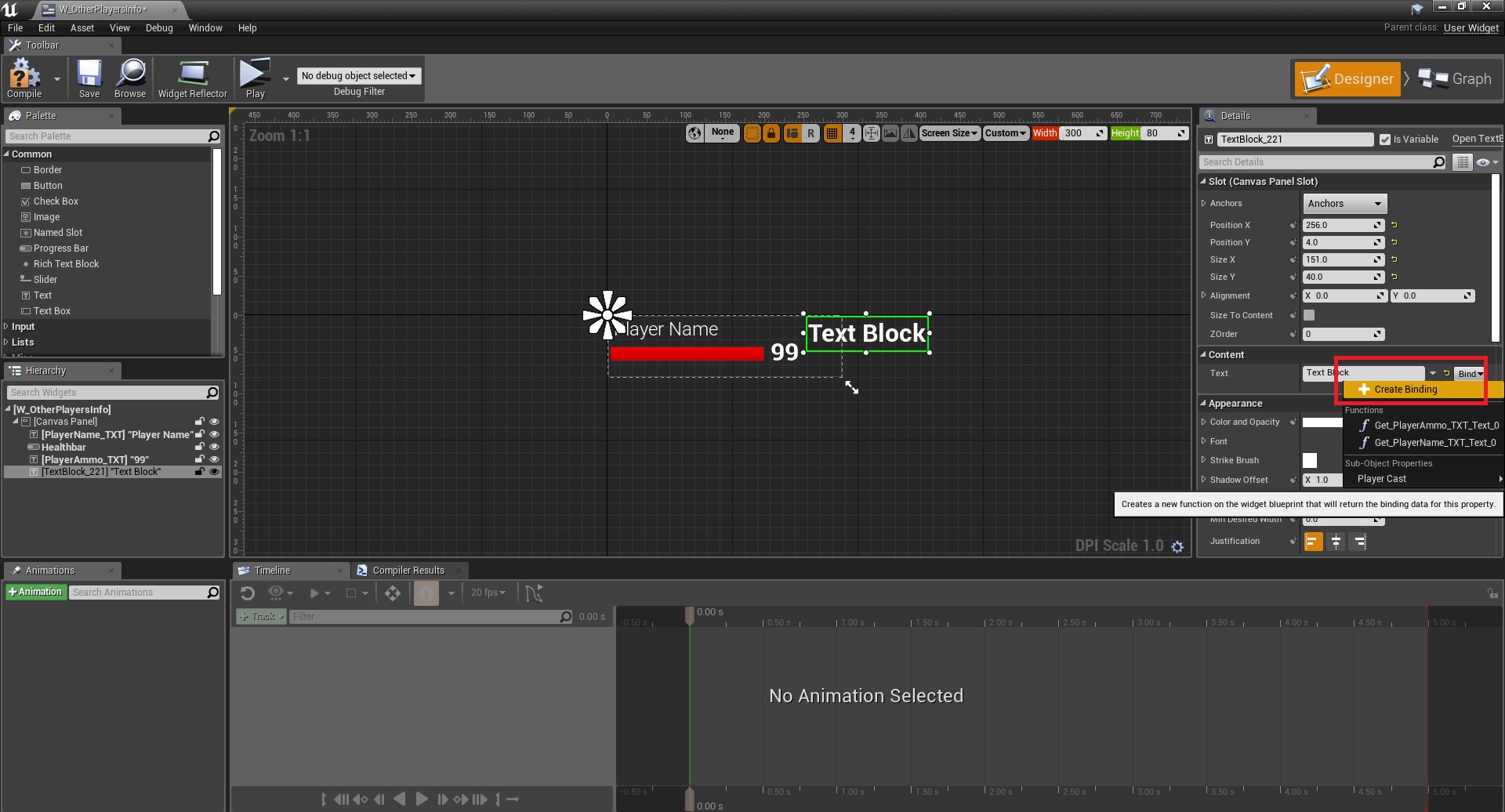5. Open W_OtherPlayersInfo and add a text there, but for this one use the create new binding function.